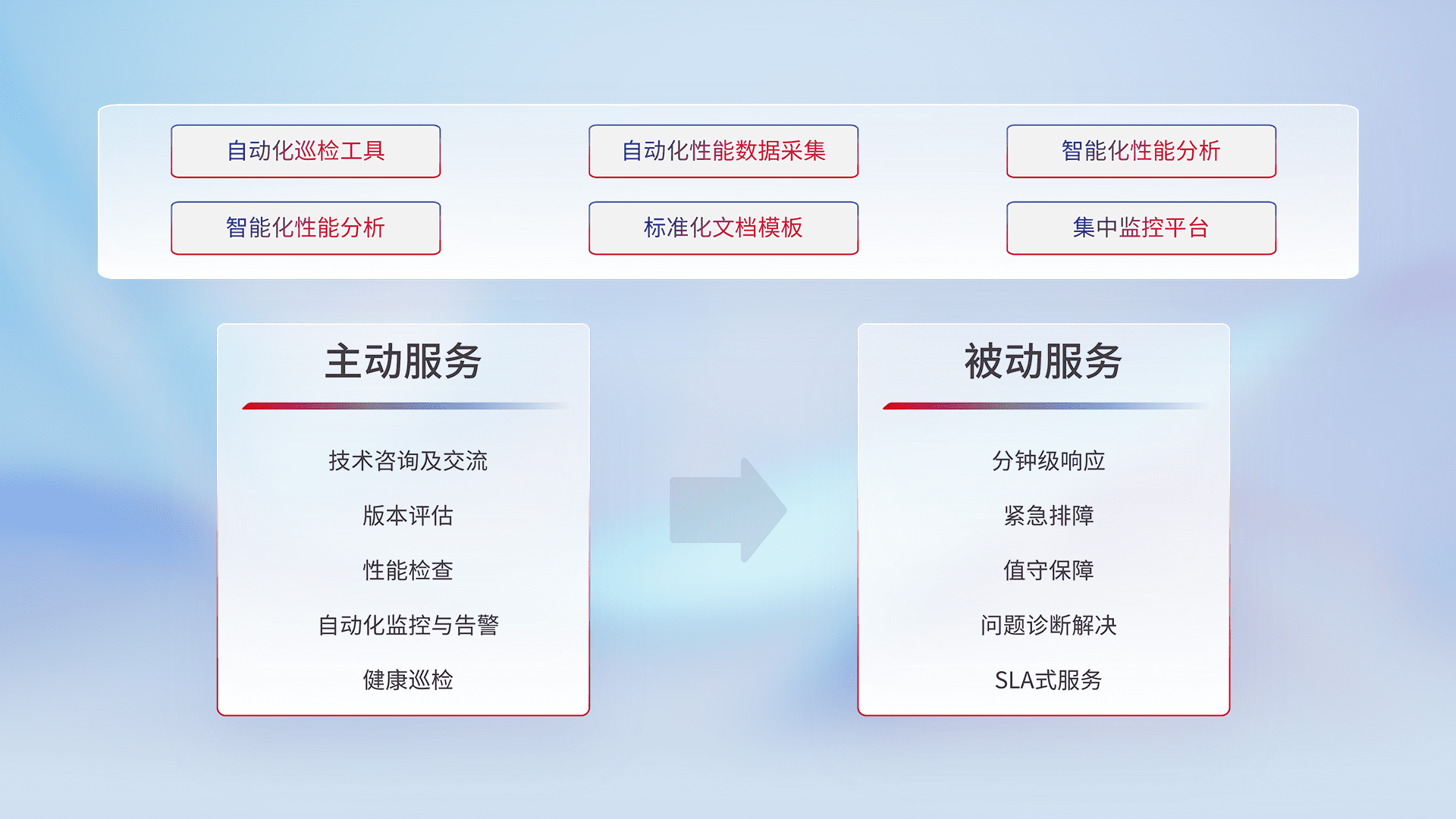 智能化工具和标准化文档,,保障服务质量,,提供主动服务(包含技术咨询、、版本评估、、、性能检查、、、自动化监控与告警、、、、健康巡检)和被动服务包含(分钟级响应、、、紧急排障、、值守保障、、、问题诊断解决、、SLA服务)。。