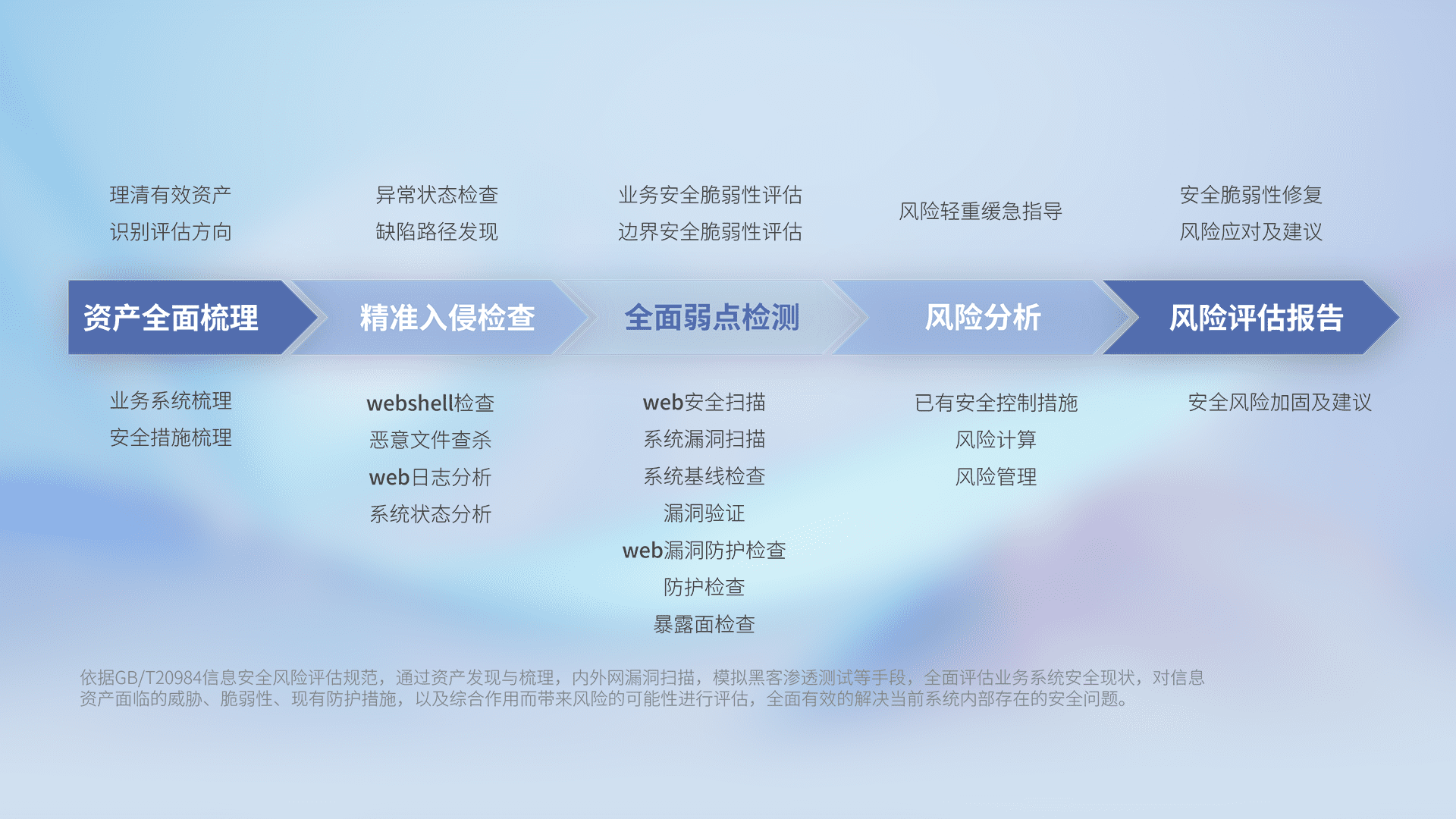 针对客户行业特性,,以专业的安全服务+多厂商联合解决方案提供专属的一站式安全管理服务,,,帮助客户全面感知网络空间威胁,,,基于识别、、、检测、、分析、、、防护、、、监测、、、、响应的服务理论模型,,从方案咨询、、、集成交付、、、评估验证、、优化加固、、、运维运营,,,,致力于为客户提供完整的闭环管理式安全服务。。。。以实战经验为客户打造高抵御风险的安全体系,,,帮助客户发现威胁、、对抗威胁、、、、处置威胁,,不断积累安全对抗能力,,,持续保障数字化安全。。。